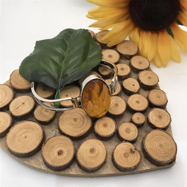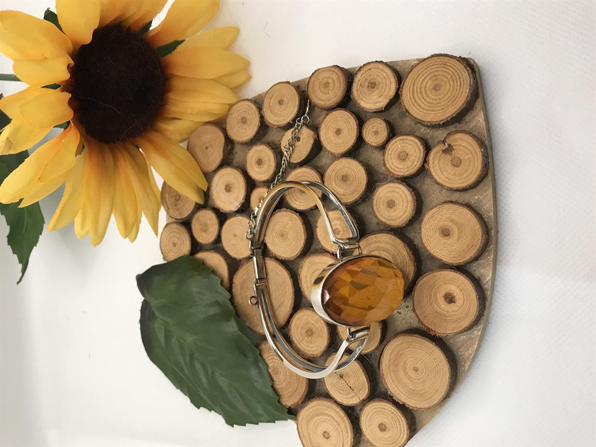Large faceted Amber piece on Silver bracelet. Includes a safety chain.