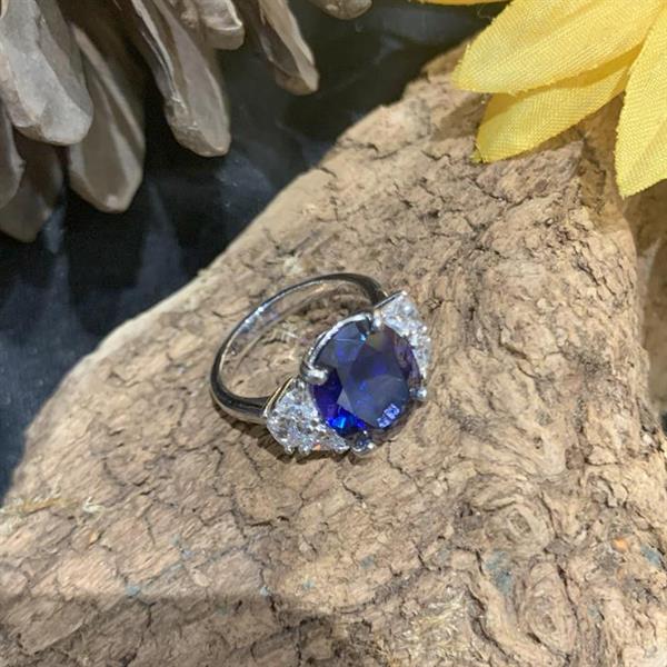Silver ring with a large blue gem and white CZ gems. Size L