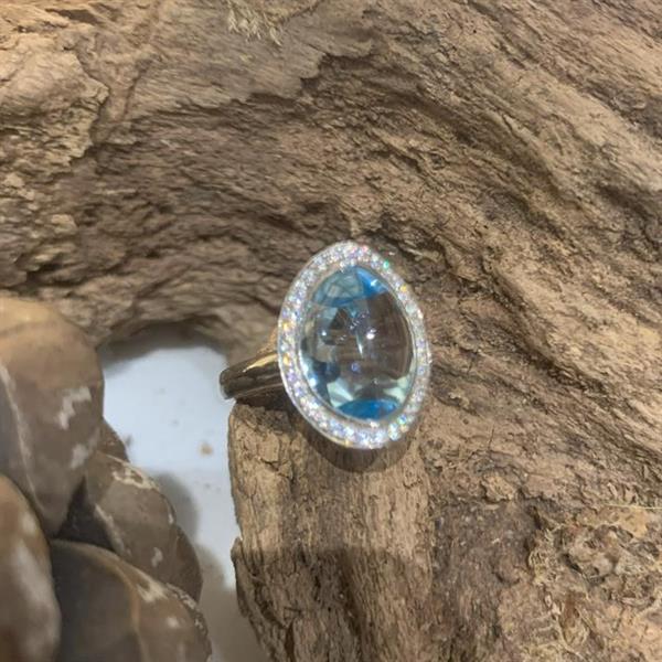 Silver ring with a large Blue Topaz with CZ. Crease ring. Size N