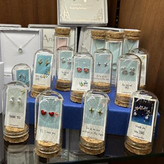 Unique sets of sterling silver earrings. Not in the usual earring boxes but in these lovely glass domes with a cork base. Every set of earrings have a unique message Thank you (Pearls) Lots of Love (Flowers) PS I Love you (Red Hearts) Bee wild and free (Bees) You and me are written in the stars (Stars) Friends are like stars (Stars) We have a variety of messages. Please call 01425 402404 or fill in our online enquiry form to check if we have a message that suits you.