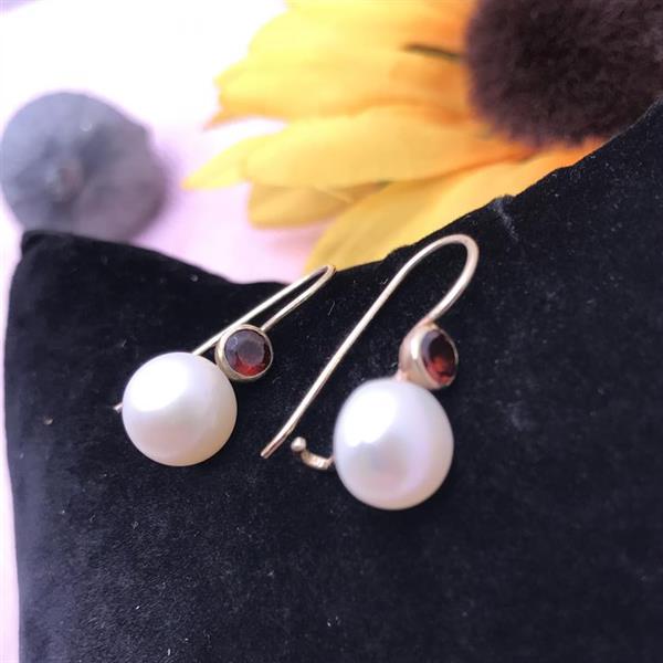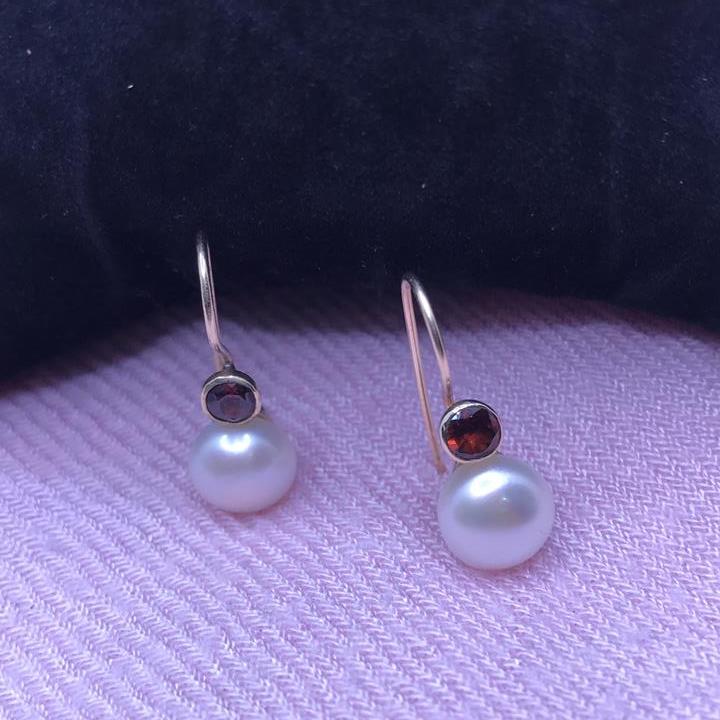 Gold Drop Earrings with Garnet and Pearl Detail.