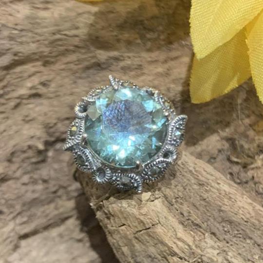 Silver ring with a large green amethyst stone with marcasite edging. Size O