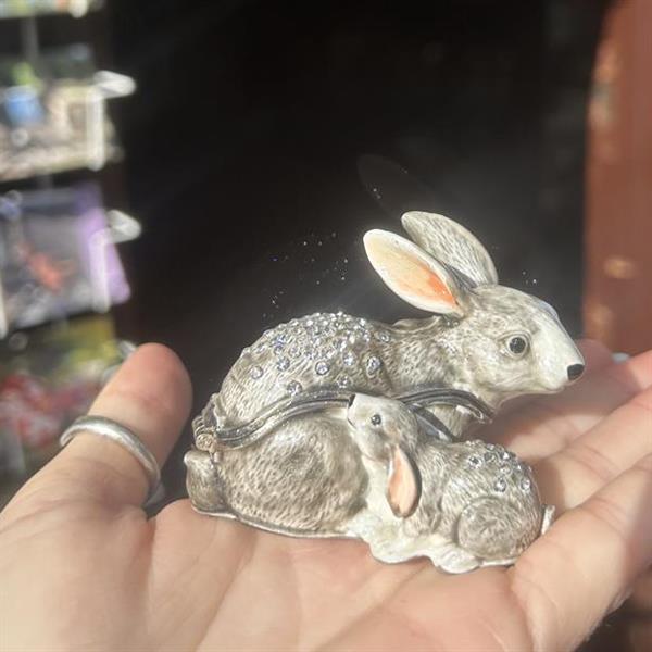 A beautiful, die-cast crystal set mother and baby rabbit trinket box. From Treasured Trinkets