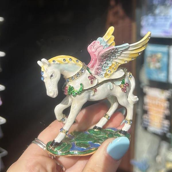 Pegasus is approximately two inches long and three inches tall, and with pastel enamels and blue, pink and clear crystals.