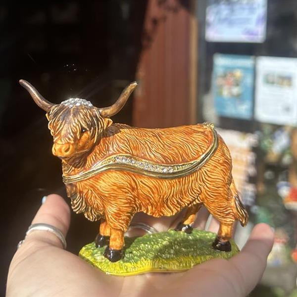 This male Highland cow Treasured Trinket box is just over four inches wide and three inches high.