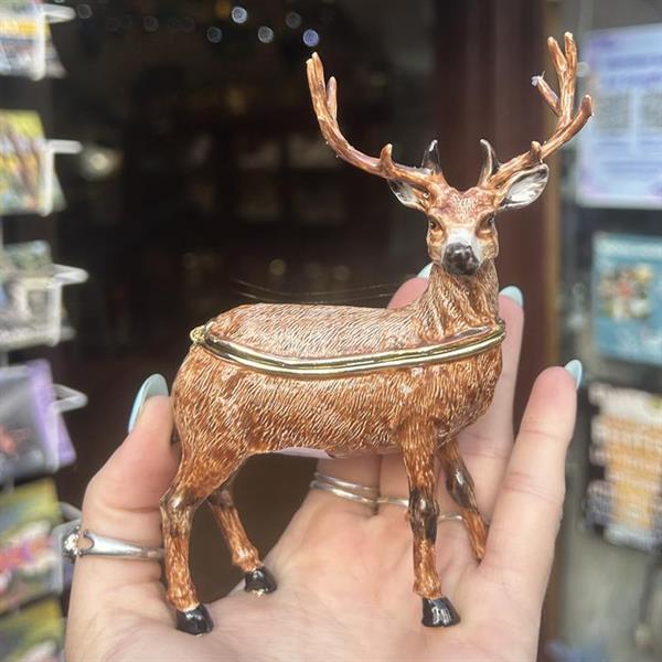 At just over five inches tall including the antlers, this magnificent red deer stag is made of base metal then hand-painted with enamels and presented in a cushioned box.
