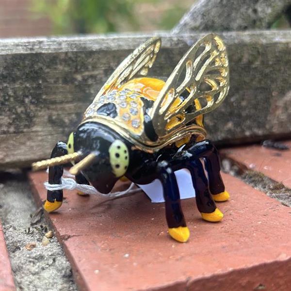 This simple bee trinket box is three inches long including the antennae, and opens just above the legs to show the hidey-hole. Made of metal with yellow and black enamel and clear crystals.