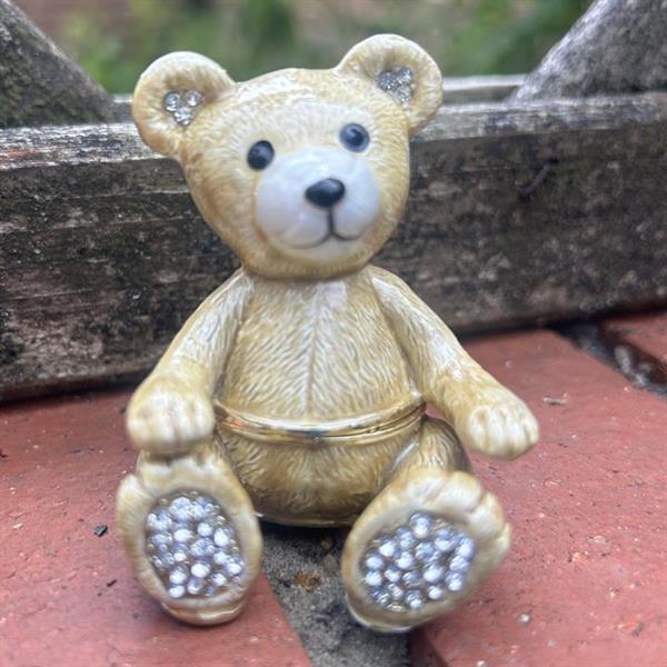 A delightful teddy bear trinket box, just over two inches tall and hand-finished with enamel and clear crystals. It opens around his waist to reveal a small cavity.