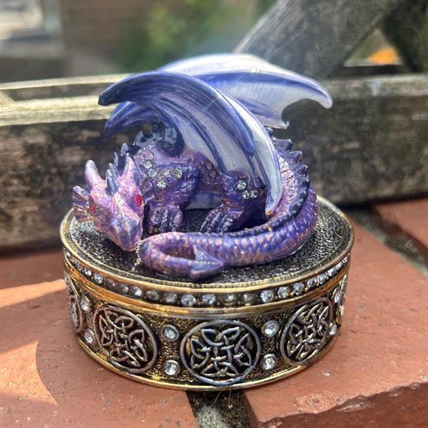 This purple dragon trinket box is approximately two and a half inches tall and comes in a padded presentation box. Great for Halloween. Embellished with clear and red crystals, it is hinged at the rear.