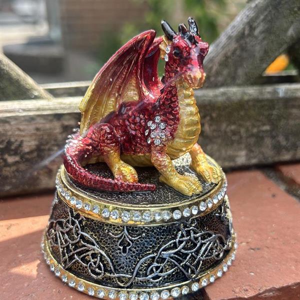 This red dragon trinket box is approximately three and a half inches tall, and is hinged at the back. It is embellished with many clear crystals, and comes in a padded gift box. Great for Halloween.